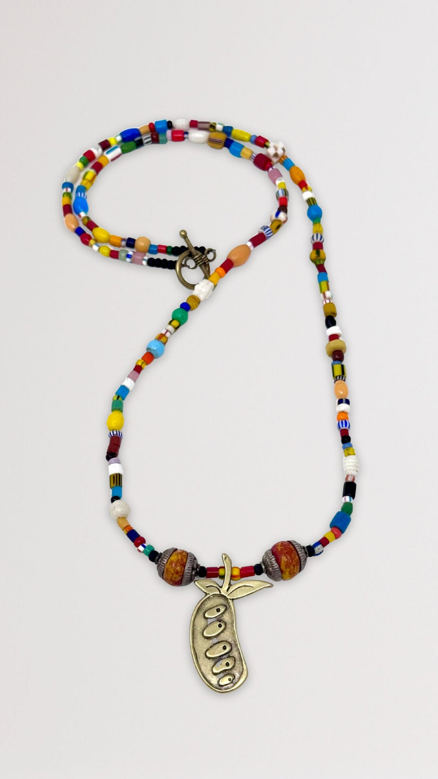 One necklace design available in three sizes, 17.5", 21.5" and 23.5". Authentic African glass Christmas Beads lend an earthy and summery look, perfect for summer. Speckled glass capped by antique metal beads support the yellow bronze Pawpaw pendant, which is based on a drawing by our core artist Troy Goins.