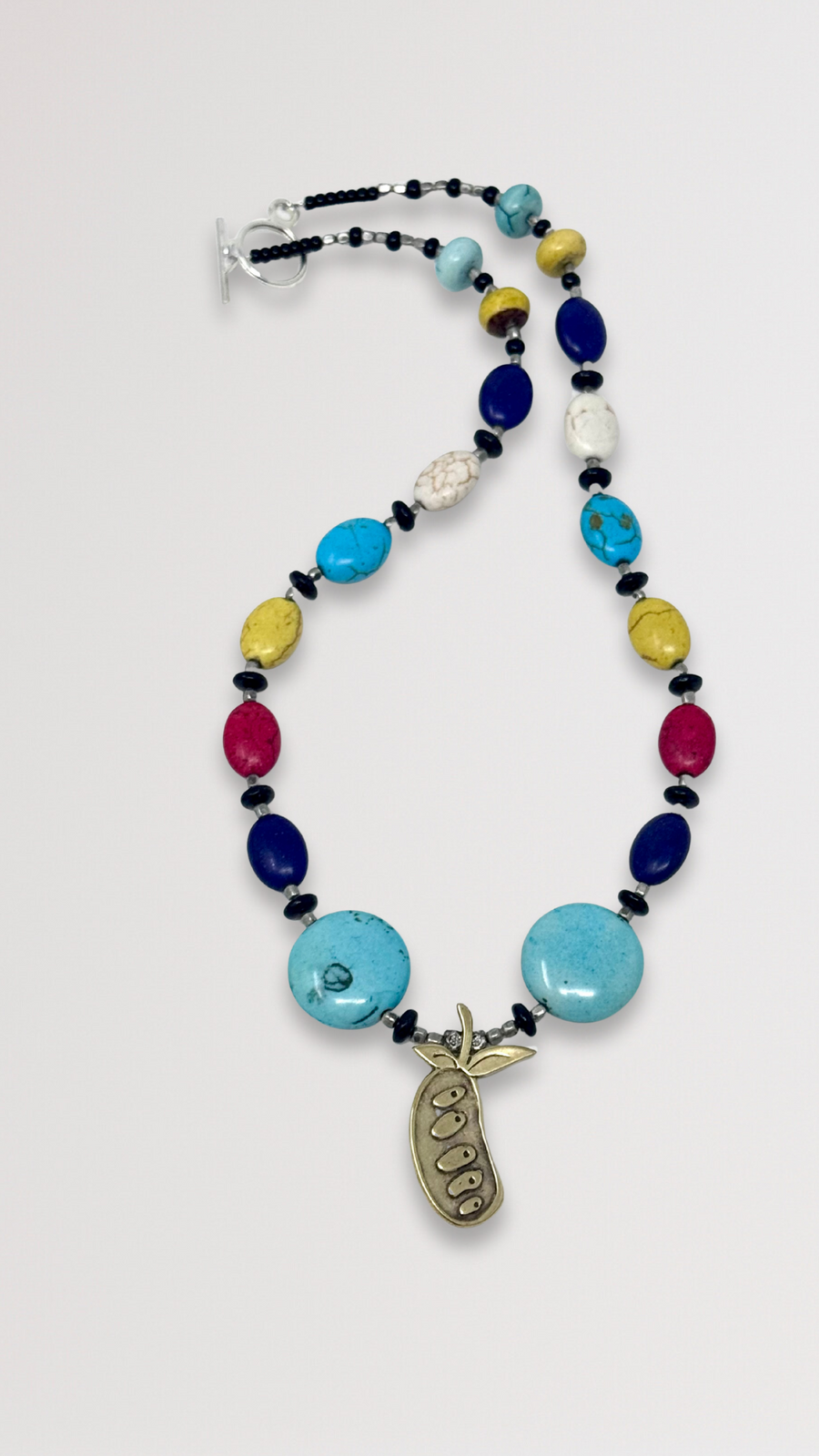 Soft and velvety dyed oval stone beads with black glass and steel beads with our yellow bronze Pawpaw charm inspired by our core artist Troy Goins. Necklace is 18.5" long and has a silver-plated toggle clasp.