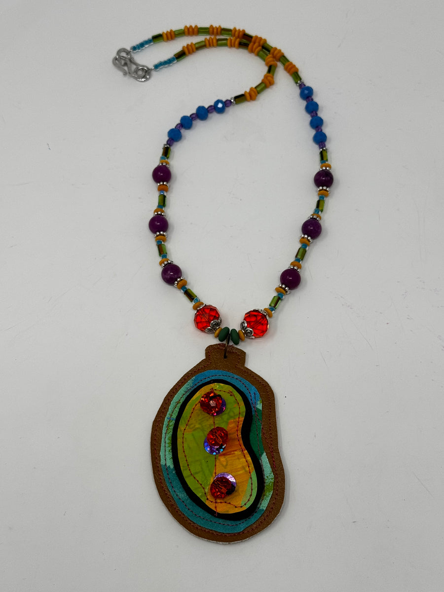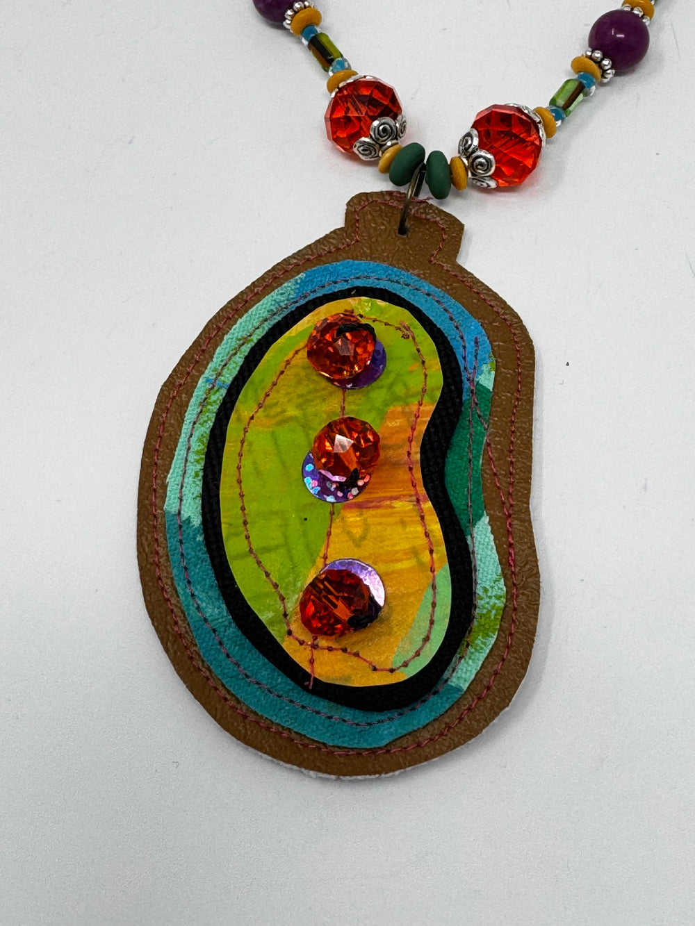 Every day is a Pawpaw Party at Passion Works Studio! This necklace features a 3.5" upcycled painted vinyl and fabric pawpaw pendant embellished with fine orange faceted glass beads and shimmery purple sequins. The beads on the necklace contain glass of all kinds, dyed magenta/purple stone spheres and silver-plated spacers. The S-hook clasp is sturdy and strong. The necklace is 24" long and 100% one-of-a-kind.