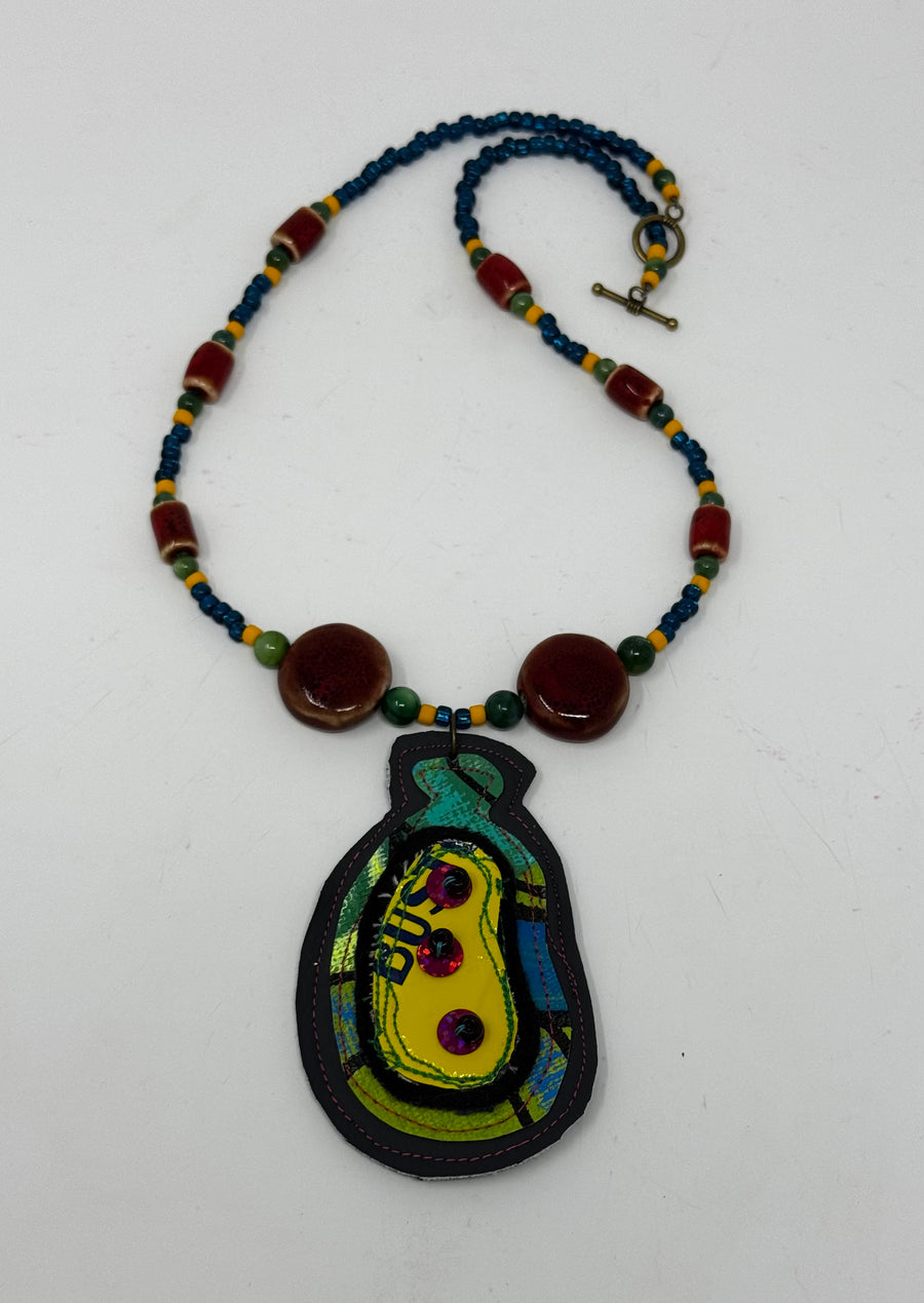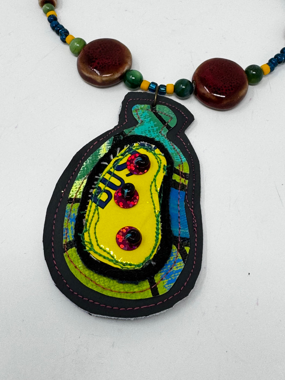 Passion Works Studio takes Pawpaw art very seriously...including with our jewelry! This 20" Pawpaw Party Necklace is a colorful yet earthy blend of glazed ceramic, dyed shell and glass spacer beads. The 3" long pawpaw pendant is made from our painted and layered upcycled vinyl, fabric and beads. The clasp is a bronze toned toggle.