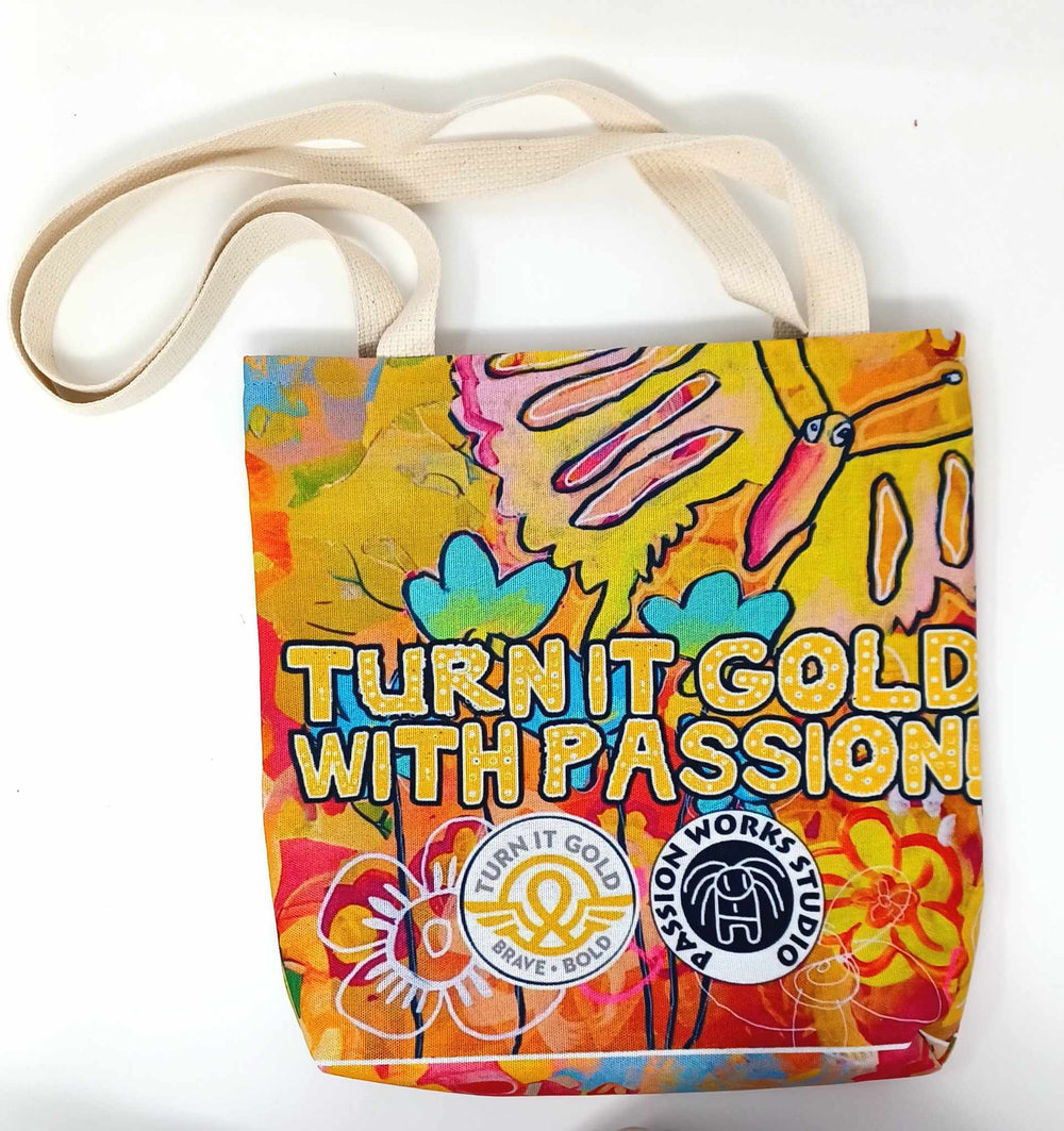 These beautiful canvas bags are part of the studio's Turn it Gold initiative-- featuring artwork from our fabulous Passion Works Artists! These are a limited edition...get yours while supplies last!