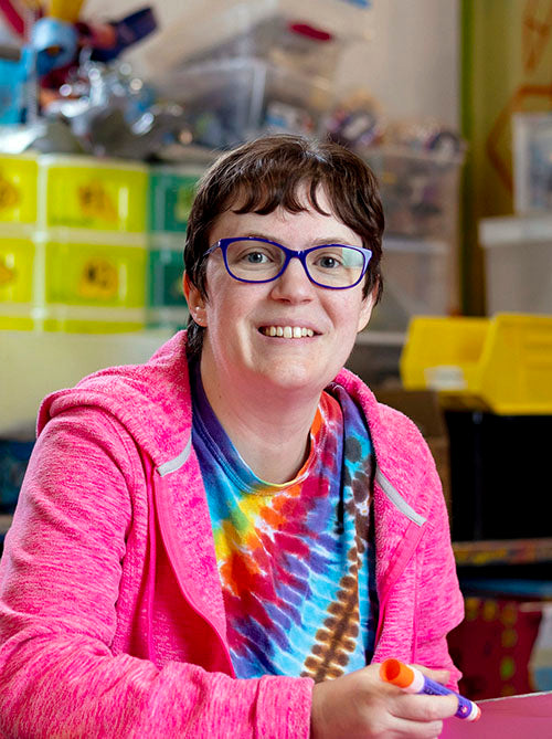 Katie is as sweet as they come! Katie is kind and thoughtful. When she walks into the studio she gets right to work on any project that needs done. She is very focused on her job as an artist at the studio. Katie's style is very whimsical and cute! Everything has a smiley face on it. She creates cat, hearts, balloons, and sunshines just to name a few. We are excited to see how Katie evolves in her style in years to come. Overall her easy going nature is a breath of fresh air and we know that she truly cares about others. What a blessing you are to the studio!