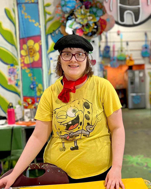 Megan has a sparkling personality! She can replicate any image in seconds with precision. Reminiscent of her interest in the Power Puff Girls, her style is very cartoonie! Her use of bold black lines and color have become her indentifiable style. Megan gets inspiration from her favorite shows like Ed, Edd and Eddy, Winnie the Pooh, and Dora the Explorer. She enjoys creating with Mean Streaks, Sharpies, colored pencils and crayons. Along with her interest in art, she loves music as well. You can catch megan singing delightful songs while she's creating. She also brings her flute to work with her everyday and loves to play it for everyone.
