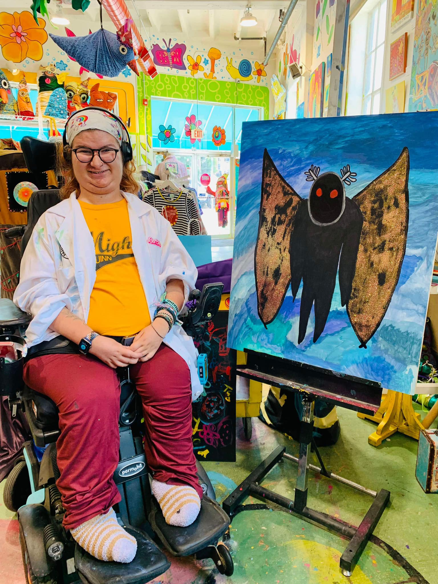 Quinn is currently living independently at Earlham College, but over the summers he loves to spend time at PassionWorks creating. They are a theatre arts major and currently specializing in accessibility within the theatre. He’s particularly fond of musicals, cryptids, and music. Quinn comes as a buy one get one deal with their service dog Hanes. The both of them love PassionWorks and all the people there.