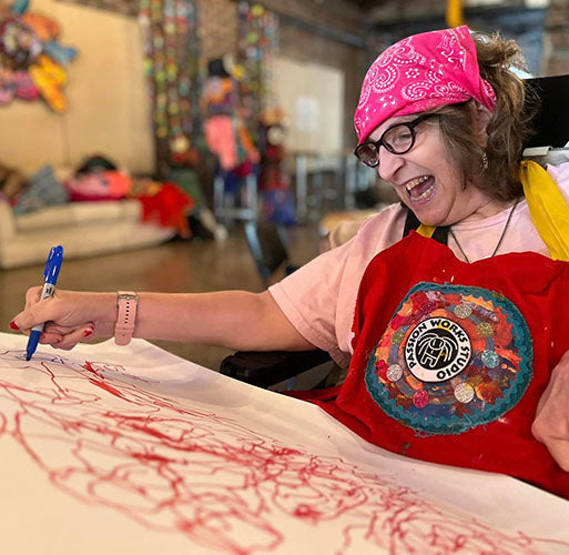 Sarina has been part of the studio since the early days! She and her hubby David fell in love in the studio. You can often find them working next to one another. Sarina enjoys all kinds of mediums. True to PWS style she loves to use a variety of colors but her favorite is pink! She is thoughtful in her process, taking breaks to critique her own work. Her hands dance across the canvas as she shares her story in every drawing and painting. She at times uses the Tobi Dynovox Eye Tracker to create drawings using her eyes. Sarina is a genuine loving advocate for her friends. She is a dedicated artist and one of the kindest souls you will ever come across.
