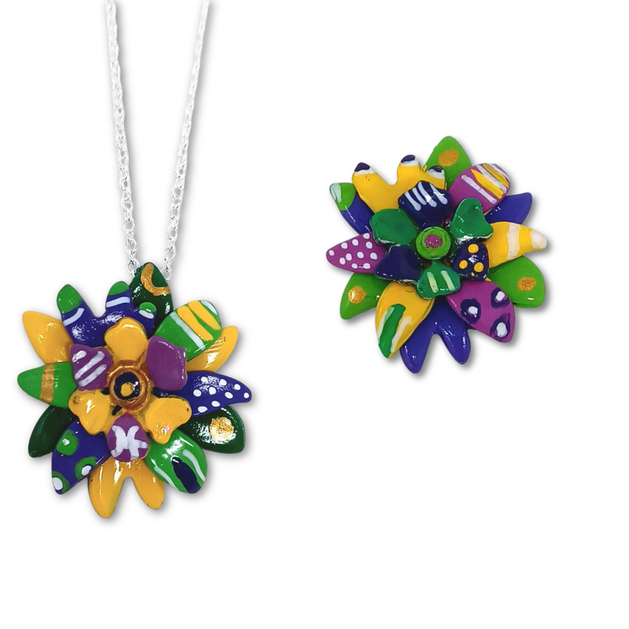 Hand Painted Pewter Mardi Gras Passion Flower Pins and Pendants
