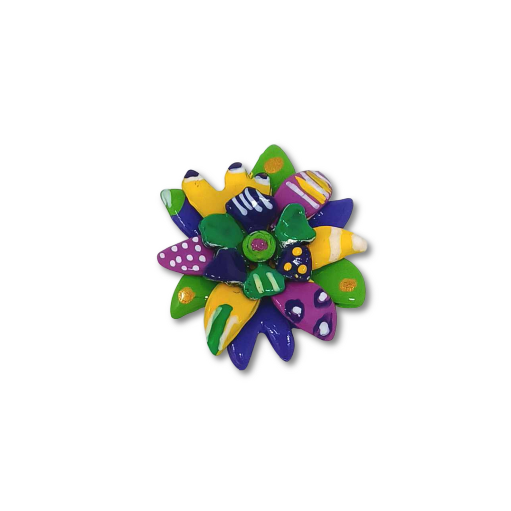 These hand-painted pewter charms are a miniature version of The Official Flower of Athens, Ohio-- The Passion Flower! Limited Edition Mardi Gras color palette, painted in small batches by staff artists Tanner and Amy. These pins measure 1 inch diameter and are 3-dimensional with overlapping petals.